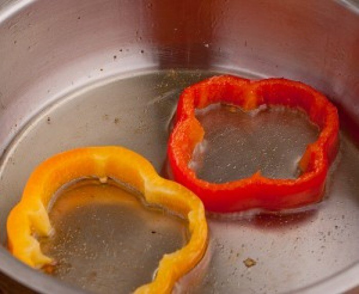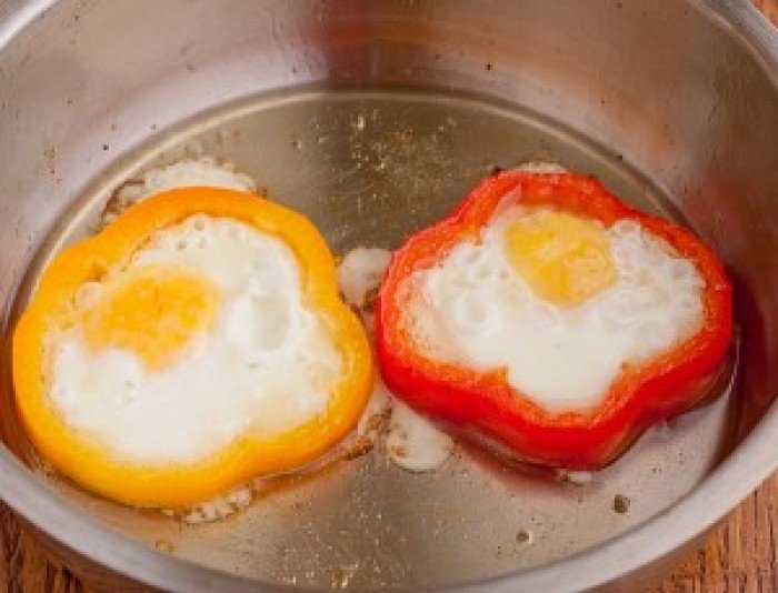 На разогретое в сковороде масло выкладываем перец. В середину каждого вбиваем по одному яйцу. Добавляем соль и перец по вкусу.
