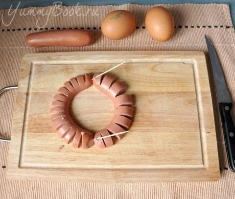 Сосиски разрезаем вдоль, но не до конца.